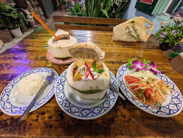 夕食、海鮮カレー、ソムタム、ココナッツジュース、チップ込1500円。