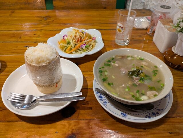 夕食、イサーン料理の豚肉スープ、ソムタム、もち米、タイレストラン、1,000円、めちゃくちゃ美味しい