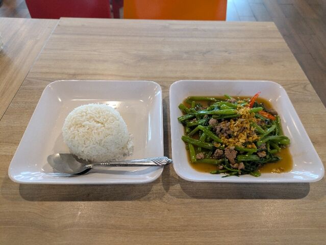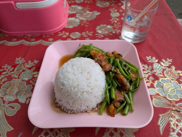 昼食、空心菜と豚肉炒め、いつものフードコート、400円、美味しゅうございます。