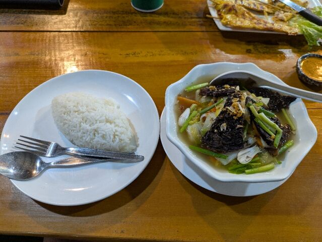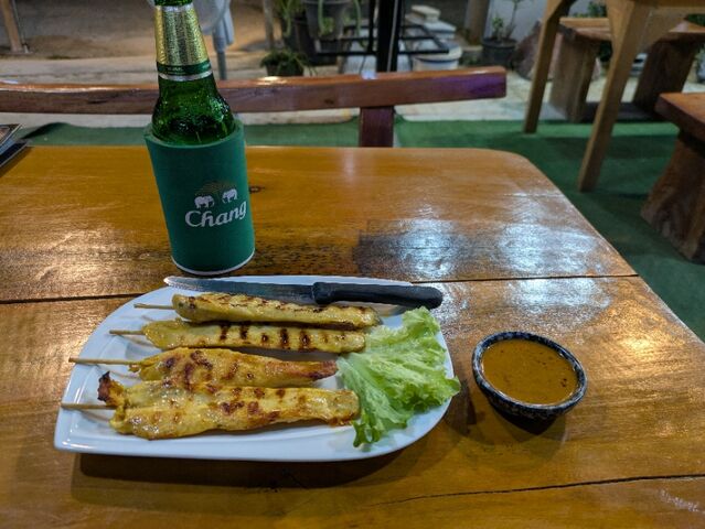 夕食、サテイ、海鮮スープ、ビール、1,500円、美味しくなかった。
