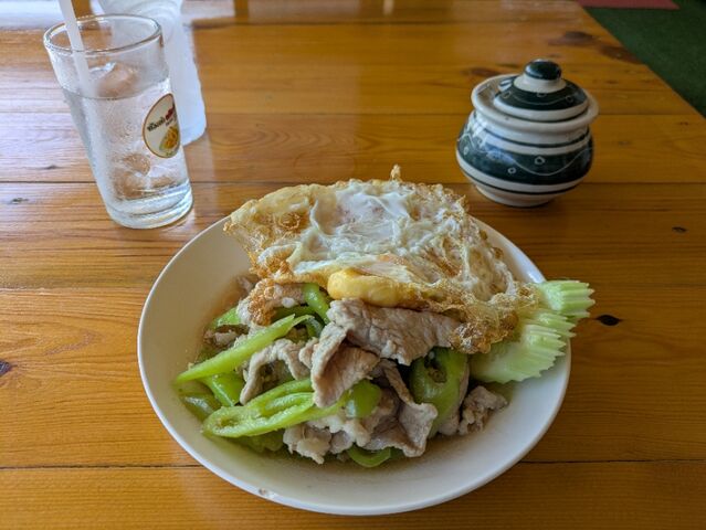 昼食、豚と野菜の炒め。400円。普通に美味しい。
