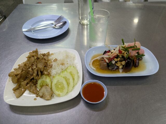 夕食、豚肉のガーリック炒め、ピータンサラダ、ローカル食堂、630円。美味しゅうございます。