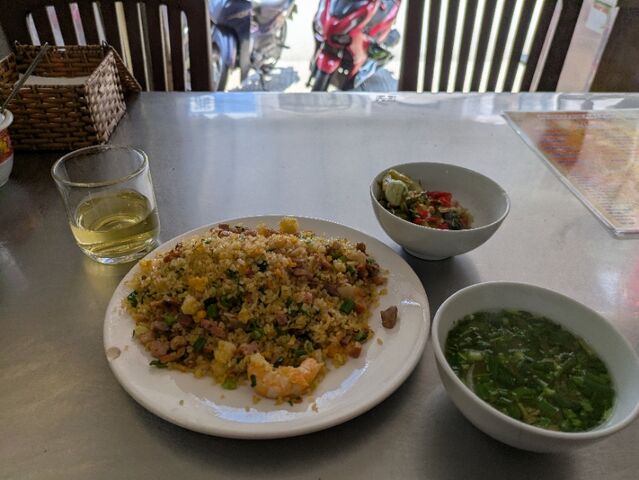 昼食、ブタと野菜のスープ、パッションフルーツジュース、630円、冷房のないフードコート、普通に美味しい。