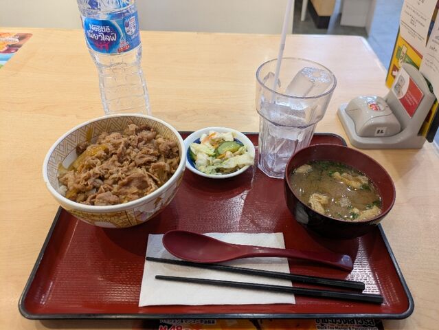 昼食、牛丼セット、水、すき家、630円、すき家の味です。