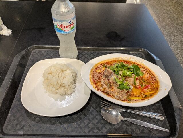 骨付き豚肉トムヤムと水、セントラルパタヤのフードコート、740円。美味しい。水は15バーツ(68円)なんだけど、値上がったかな?