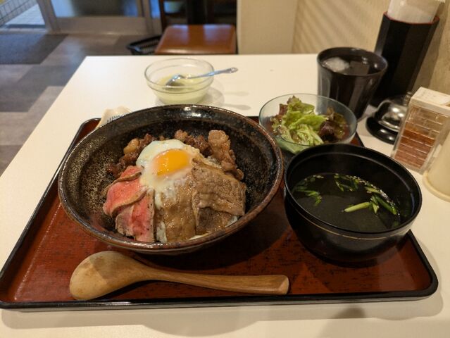 昼食、肉3種類丼セット、980円。昼食は1,000円を覚悟しなくてはならなくなってきた。ワンコインで昼食を食べてた頃が懐かしい。